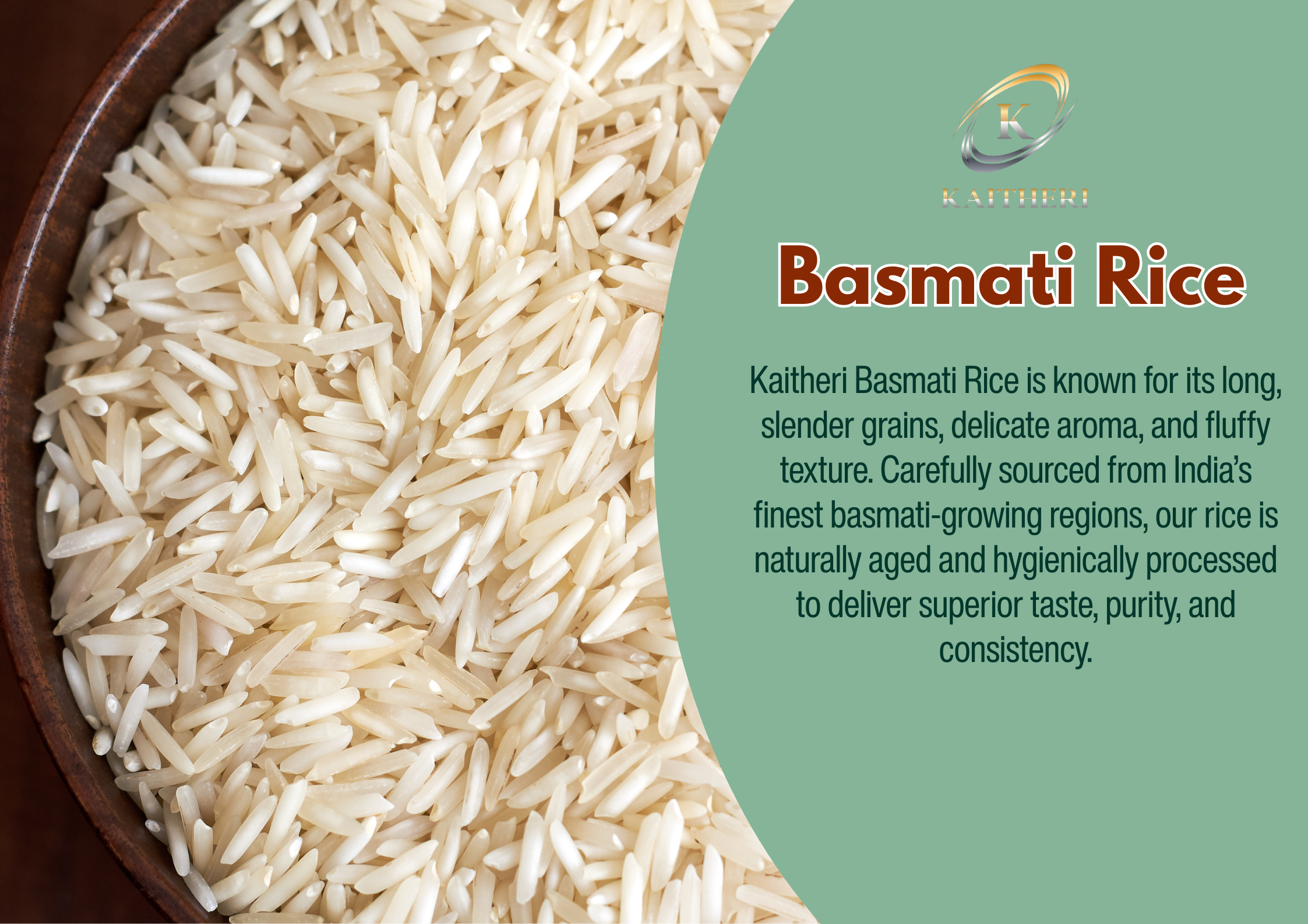 Kaitheri Basmati Rice is known for its long, slender grains, delicate aroma, and fluffy texture. Carefully sourced from India’s finest basmati-growing regions, our rice is naturally aged and hygienically processed to deliver superior taste, purity, and consistency.